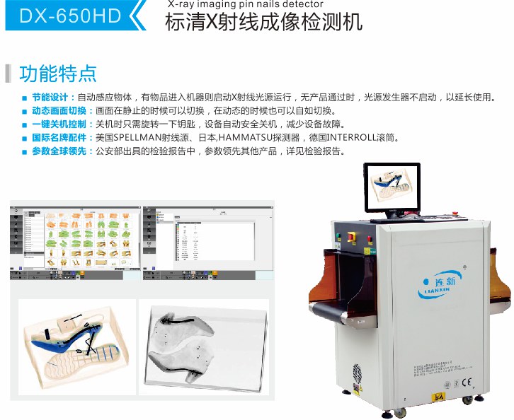 功能特點:DX-650HD X光鞋子驗針機,是一款標清的X光驗針釘設(shè)備,適合用于鞋子手袋箱包等工業(yè)生產(chǎn)質(zhì)量檢測場所,是檢品環(huán)節(jié)一款重要的檢測儀器。